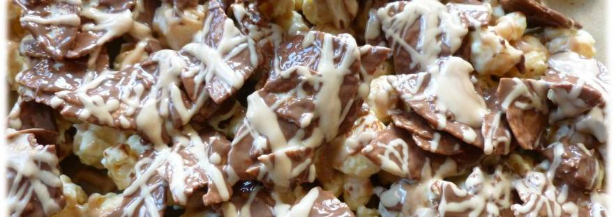 Finally, melt the Caramac bar and using a teaspoon, drizzle it all over the popcorn / chocolate potato crisp combo.